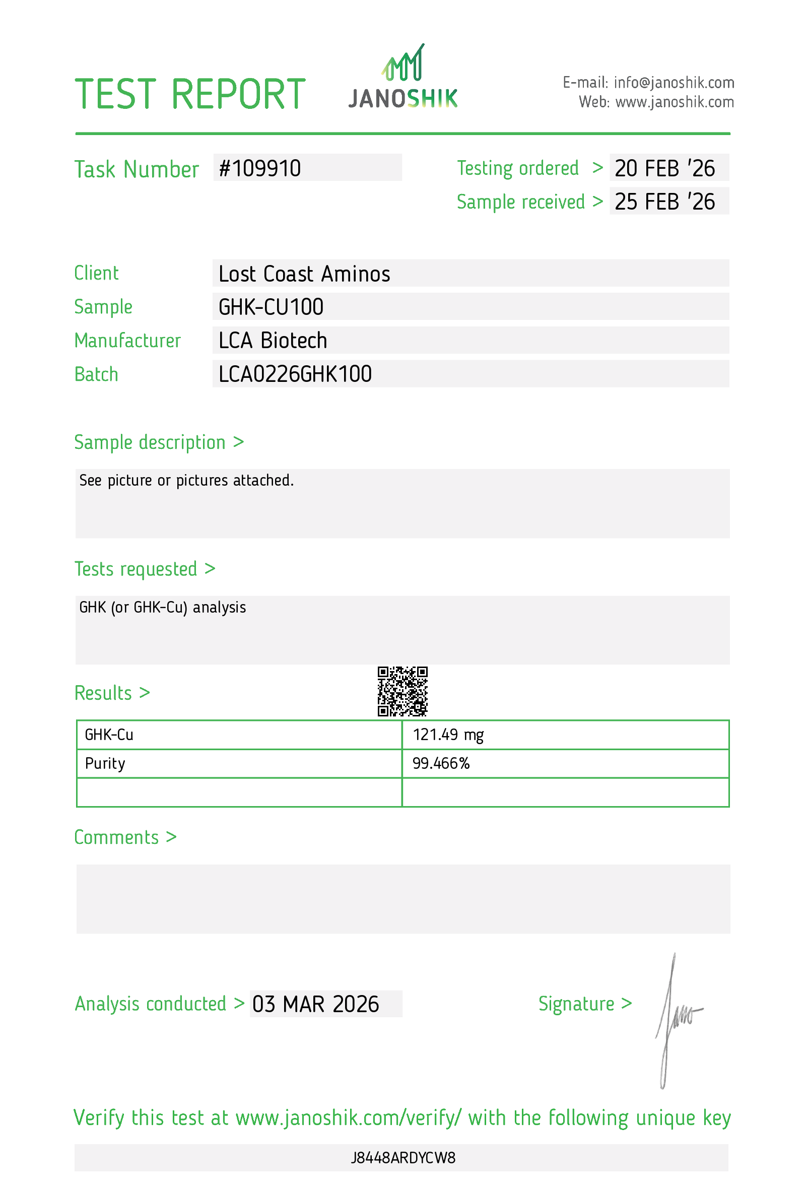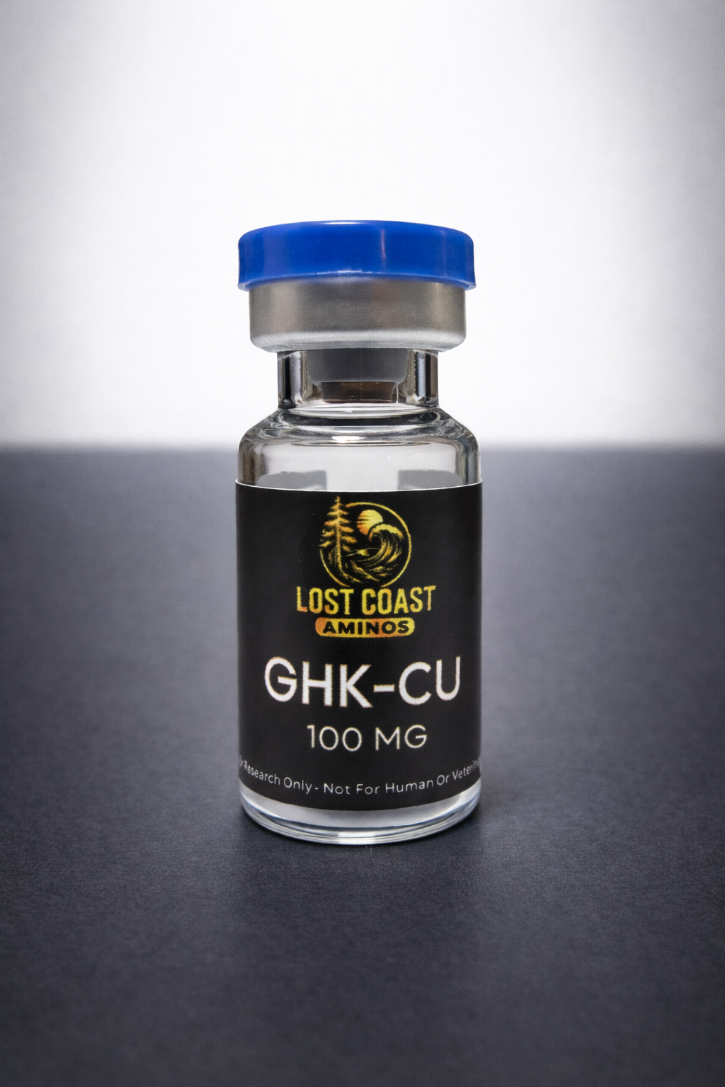 GHK-Cu is a copper-binding tripeptide (glycyl-L-histidyl-L-lysine complexed with copper) widely studied for its role in peptide-mediated signaling and cellular communication pathways. It is commonly examined in research involving extracellular matrix dynamics, structural protein interactions, and biochemical signaling processes.